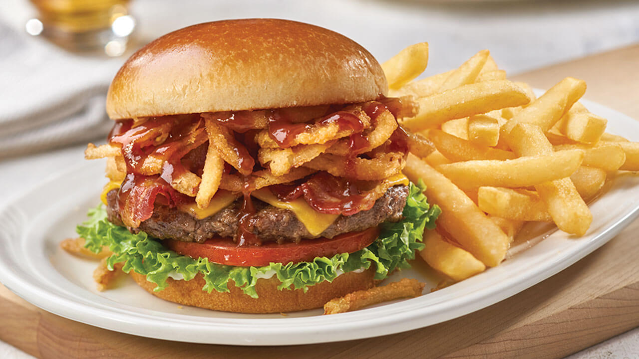 Karamelize soğan, bbq sos, dana bacon