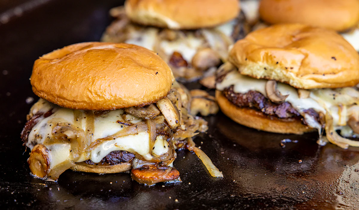Karamelize soğan, bbq sos, dana bacon